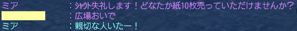 「イングの人に紙買ってもらえないかシャウトしてみよう!ダメならマジで採集すりゃいいさ」って、ダメ元で、しかもシャウトなんて滅多にしないから恥ずかしくも思いつつ叫んでみたのね。